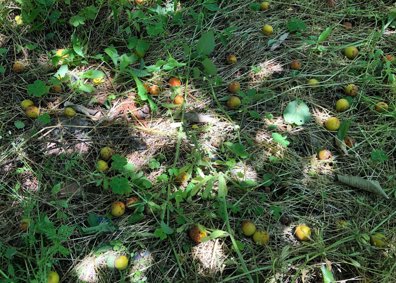 | もっと早い時期に収穫すると小梅はきれいだが実が小さくなる。 で、毎年木の下がこんな感じの時に収穫しているのだ。 |