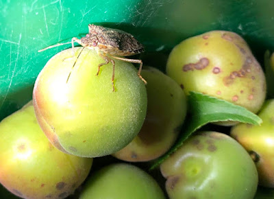 | 小梅を好むのはクサギカメムシみたいだ。 今日収穫した小梅にはカメムシの吸った跡がしっかり残っている。 カメムシは木の実に付いているが、収穫した小梅にまで付いてきたのには閉口だ。 |