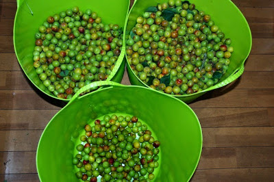 上の二つの容器の入れているのが、水洗いする前の小梅。 |