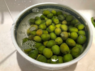 次に薬局でゲットした苛性ソーダで1%の水溶液を作ってオリーブの実を漬け込んだ。