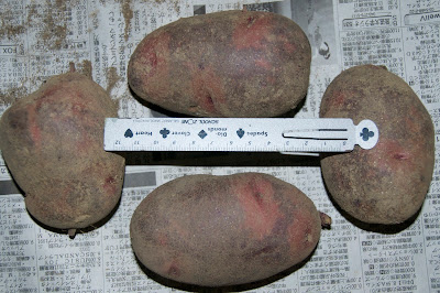 | こうしてサイズを測っていると、最終的にどれくらいの芋が採れるのか楽しみだ。 その昔ヒラタクワガタを捕ってきては、メジャーを当てて大きさを測っていたのを思い出す。 |