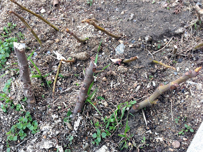 | 左側に3本挿しているのが昨年11月に挿し木してみたもの。 根づいているかどうかは不明だ。 右側に並べているのが今日挿し木のために取ってきた枝 |
