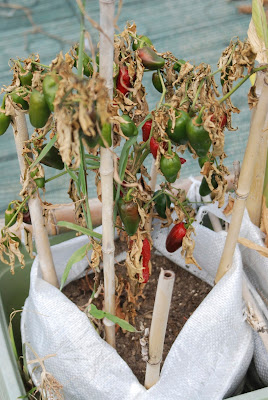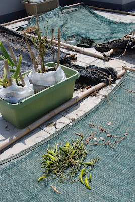 | 刈り込んだシシトウに似たトウガラシ。 これらも切り込みと水やりで復活してくれると嬉しいのだが。 |