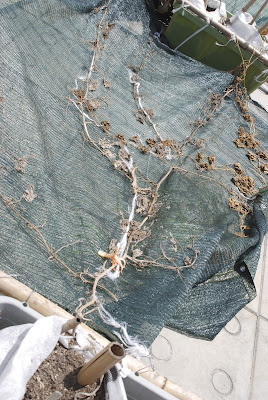 | こちらはキュウリ、枯れた蔓にぶら下がる黄色くなったキュウリが惨め。 |
