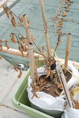 ナスも畑の方は地植えも、土嚢袋の方も元気なのだが、こちらは完全に枯れた。