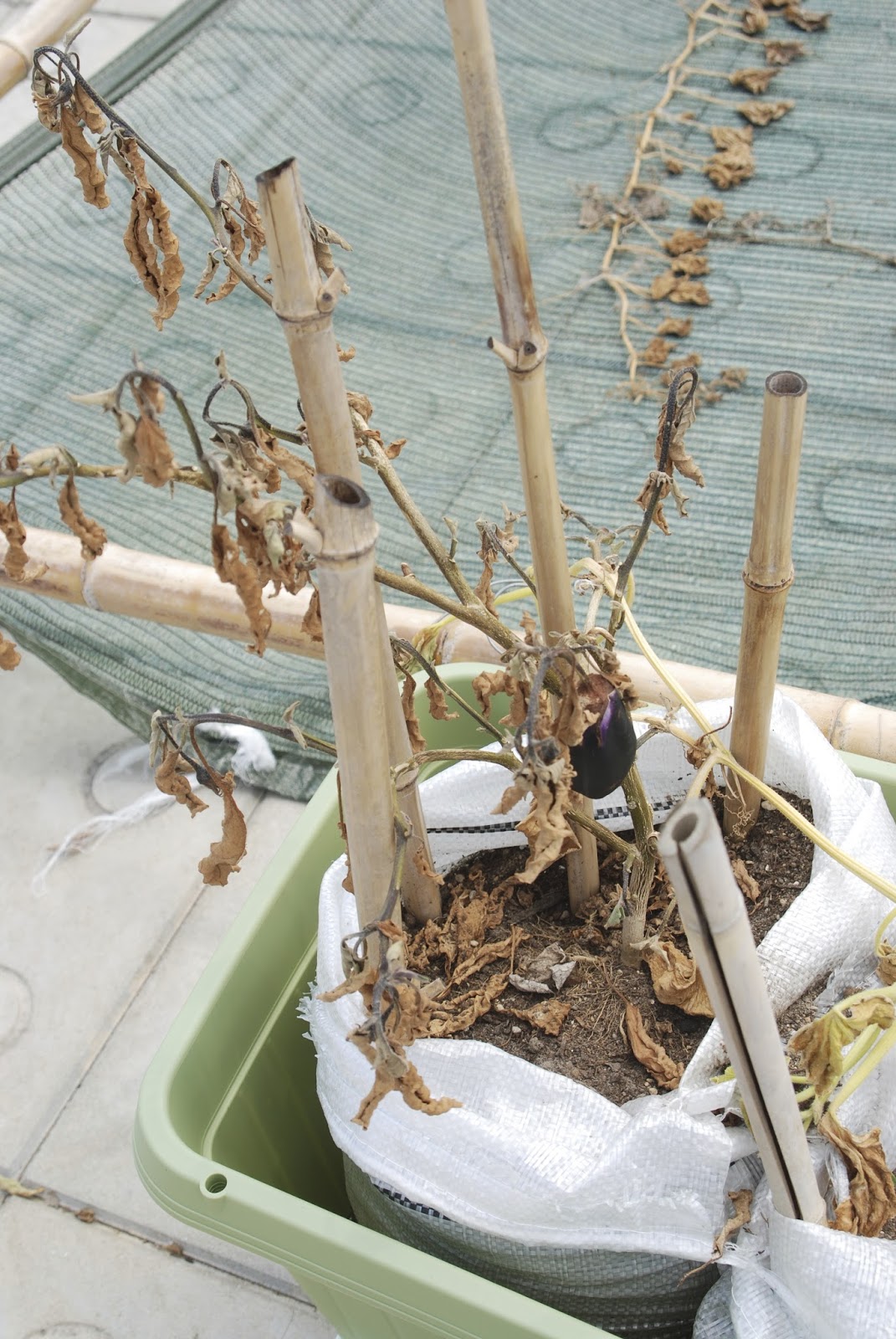 ナスも畑の方は地植えも、土嚢袋の方も元気なのだが、こちらは完全に枯れた。