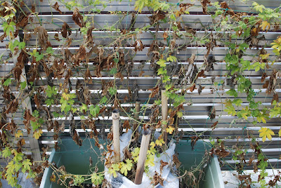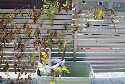 畑のカボチャの空中栽培は復活していくつか立派な実を付けているが、屋上のカボチャは旅行に出かける前にすでに枯れていた。