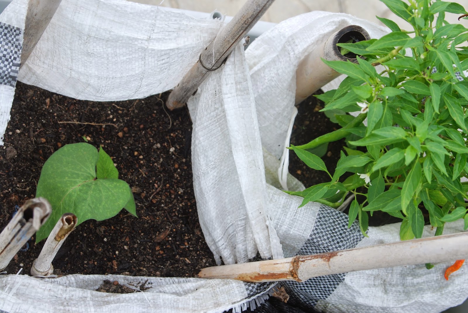 | このゴーヤを植えた土嚢袋の周りは水がいっぱい。 この感じだと、もし来週1週間天気続きでも水不足にはならないだろう。 |