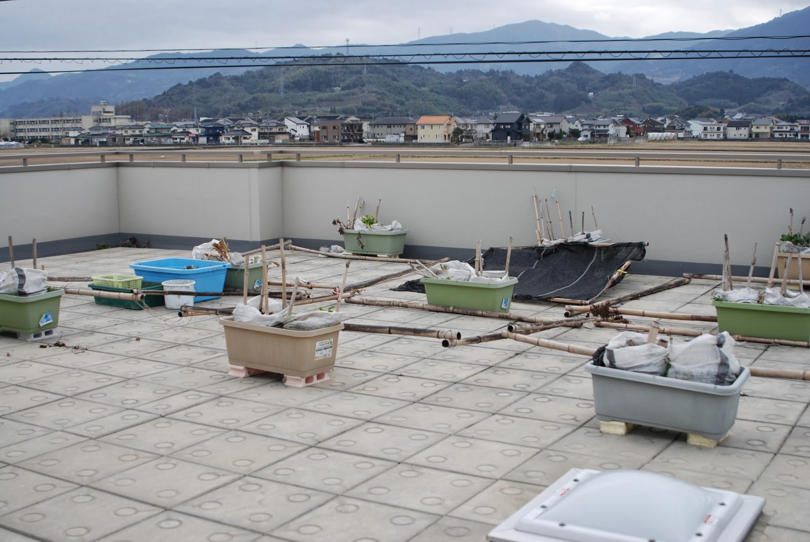 土嚢袋のいくつかには小さな葉っぱ野菜が植えているが、収穫後何も植えてないものもあり、鳥でも遊びにきてくれないと寂しい景色になっている。