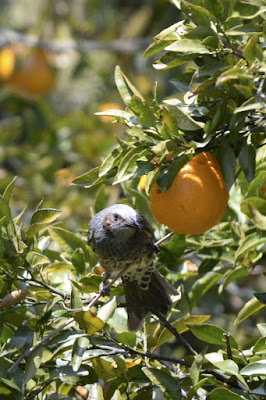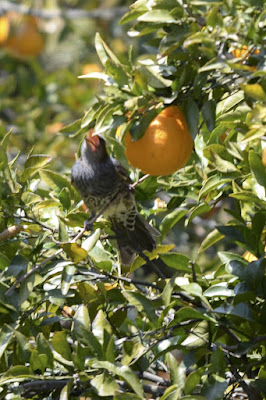 | このヒヨドリ、私を気にしたのは最初だけ。 あとは気にせずミカンを口いっぱいに何度も頬張っていた。 |