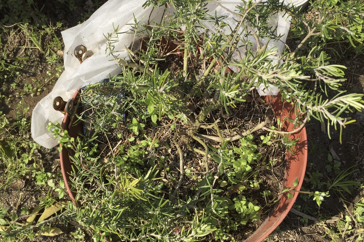 さて、昨年12月初めにプランターにローズマリーとラベンダーを挿し芽して、防寒用にビニールカバーをかけていた。