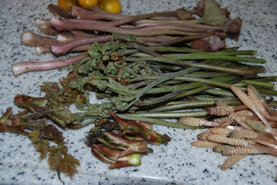 | 奥からツワブキ、ワラビ。 手前が左から野生種のダラの芽、園芸種のダラの芽、そしてツクシだ。 |