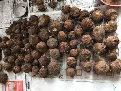 こちらは先日第1菜園の畝に大きな方から13個を取り出して植ええ付けた後、まだたくさん残った、使える状態の親芋たち。