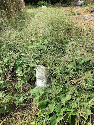| こちらも3列に土嚢袋を並べているのだが、雑草でその土嚢袋が見えない。 |