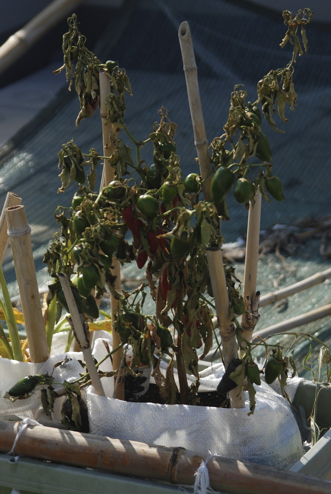 8月の旅行中、屋上菜園は干ばつ菜園と化し、完全に枯れてしまった野菜と枯れる寸前の野菜があった。