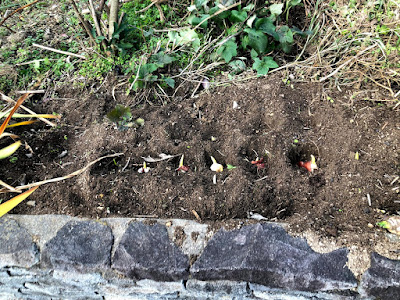 | こちらが、雑草を抜いてチューリップを植え付けているところ。 明日は残っているユリやフリージアの球根を植え付けよう。 |