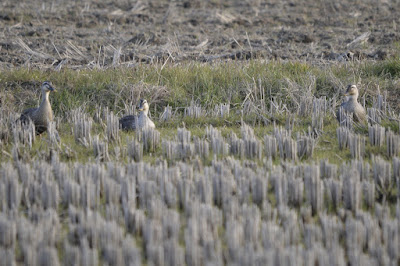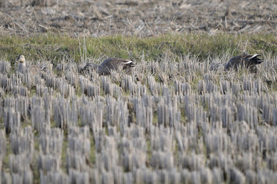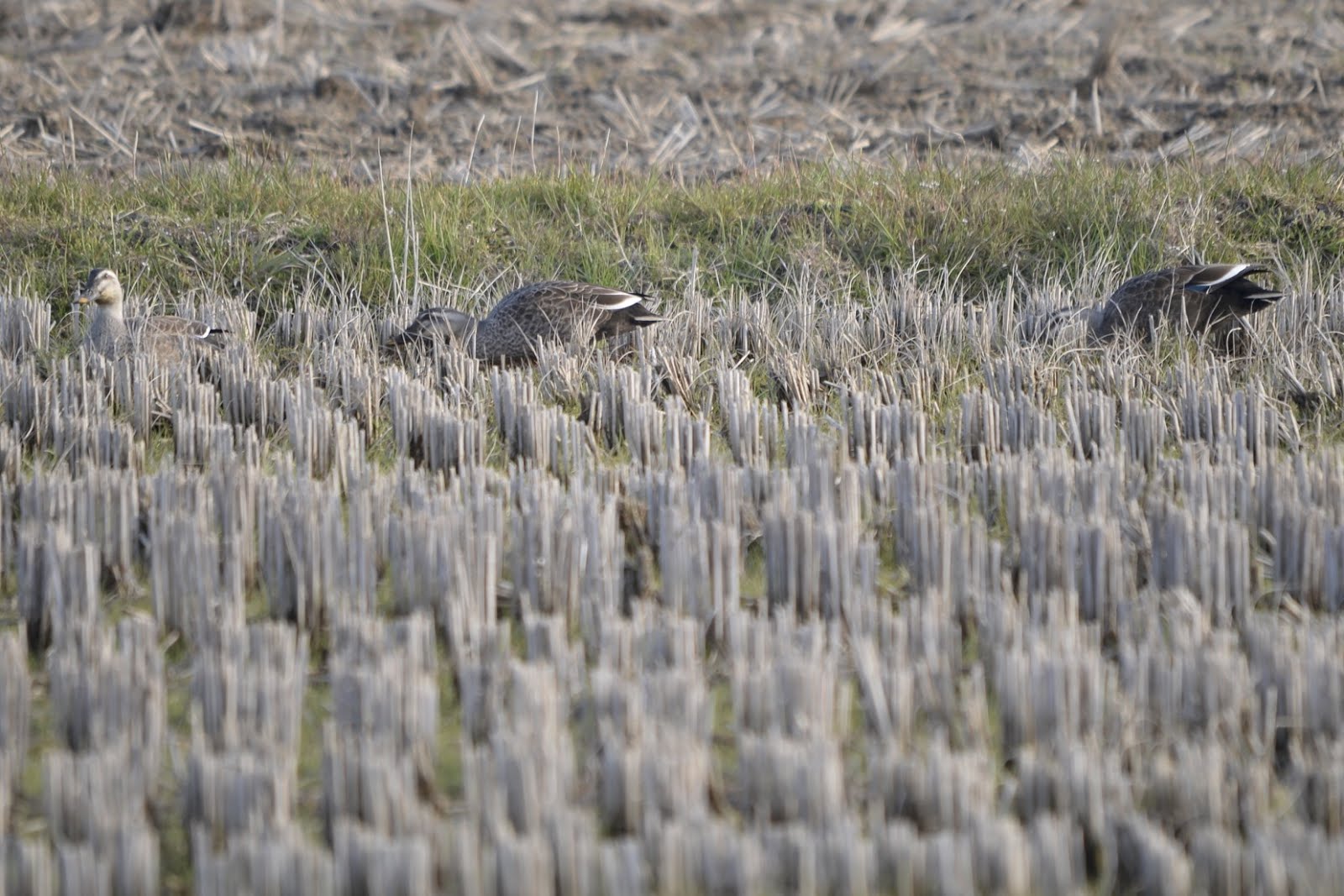 畑の遠くに見えているのは、今年から見かけるようになったカルガモ。 大人は、どこかに人影や他の鳥が見えると、少し気になっているようだ。 |