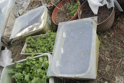 一方、ビニールシートはまだ余っていたので、温室内の加温装置がない場所のポットの上にも被せてみることにした。