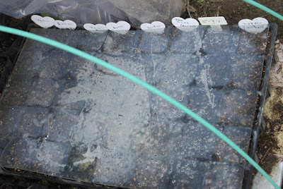 果たして、このビニールシートでの保温効果はどうだろうか? ここのポットには、このシートとトンネルと二重のビニールシートが掛けられた形だ。 |