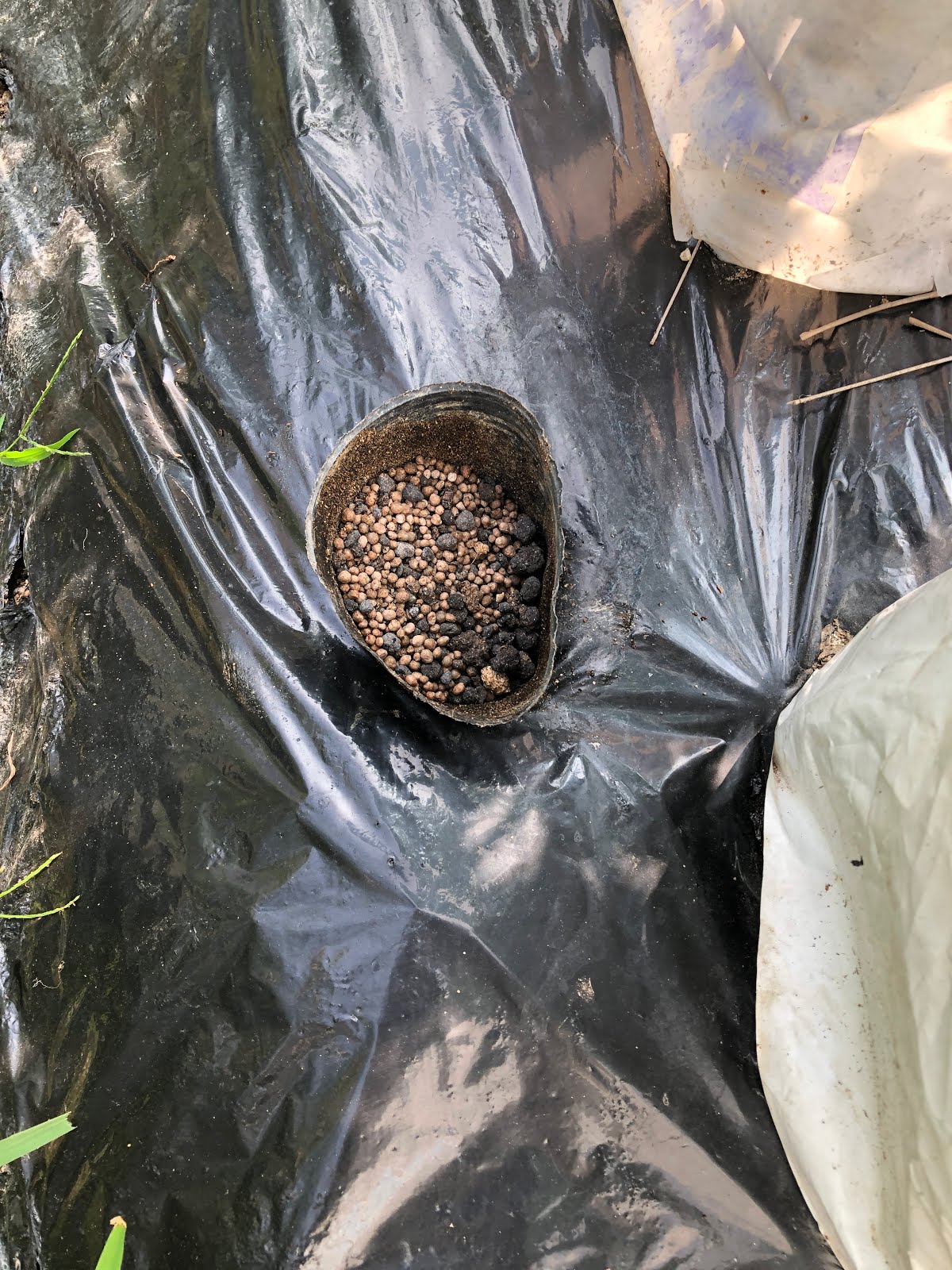 | こうして肥料を置くと、雨などで少しづつ肥料が染み出る。 マルチに空けた穴にピッタリ、ビニールポットが嵌っている。 |