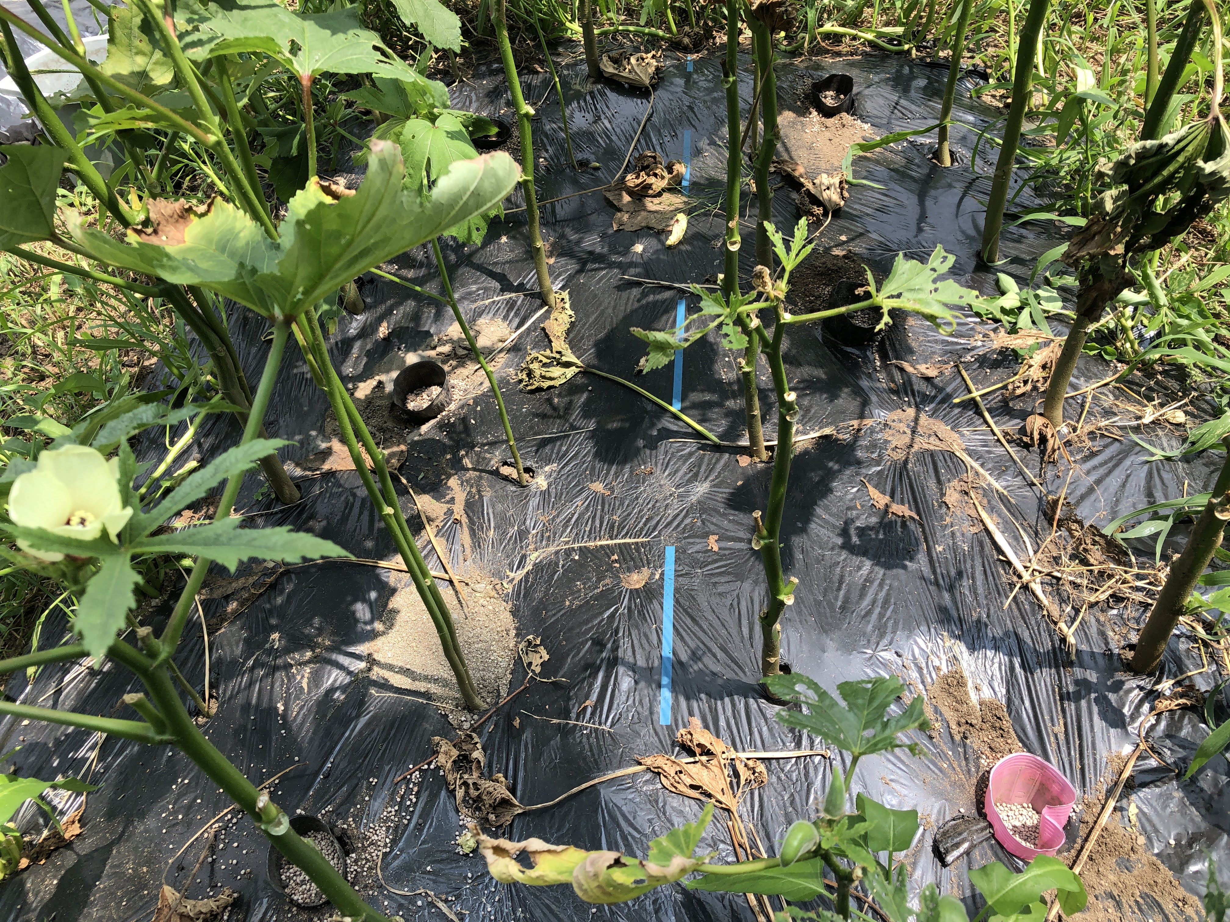 | こちらはオクラの畝。 ここにも肥料が入ったビニールポットを置いている。 |