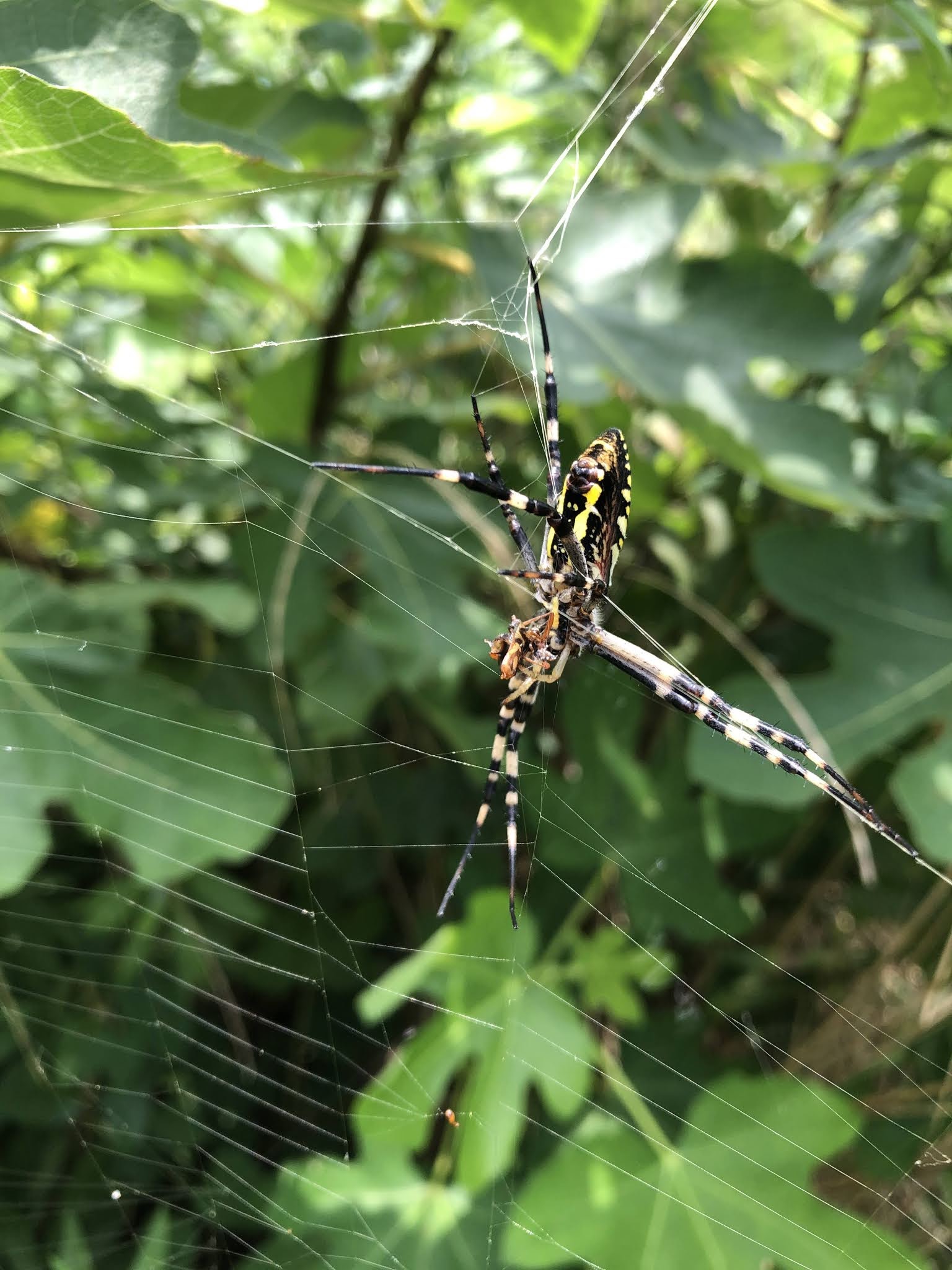 | イチジクの木にはもうじき熟れるイチジクの実がたくさん成っている このクモの巣がそこに集まるスズメバチを捕捉してくれることを願っている。 |