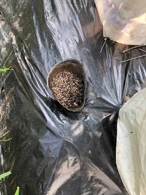 数年前から、この時期の夏野菜の苗には、復活を期してビニールポットに肥料を入れて苗間に置いた。