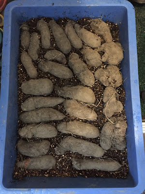 そこにミミズ堆肥と少量のバーミキュライトを混ぜた土を敷き詰め、その上に種芋を並べた。