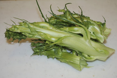 | プンタレッラは葉も食べられ、とても美味しかった。 でも、一番の期待はこの花芽だ。 花芽の下の茎の部分は空洞になっているが、ここは生のサラダが美味しいようだ。 |