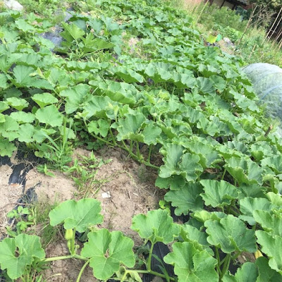 | ここが、第2菜園のカボチャの畝。 蔓が1日に1mくらい伸びているのでは思われる元気さだ。 |