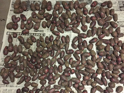 | いつものように、持ち帰った芋は新聞紙の上に広げてしっかり乾燥させている。 第1陣のように15cmに届くような大きな芋はなかったが、それでもまずまず上等だ。 |