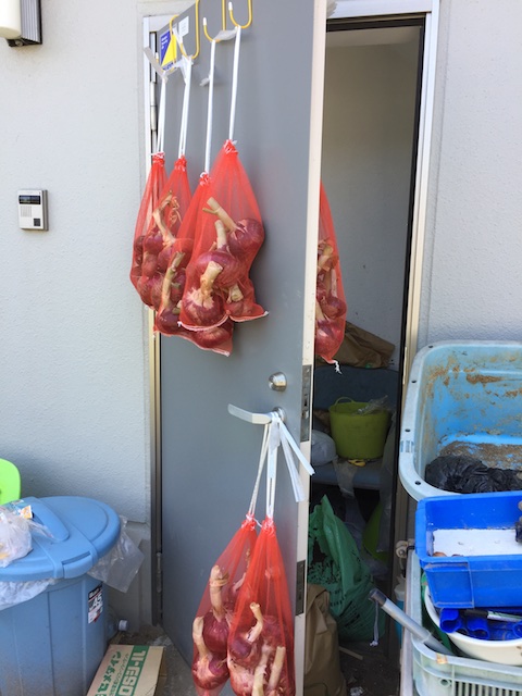 収穫した玉ねぎは、一部は家に持ち帰り、他はネットに入れて吊るしている。