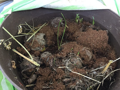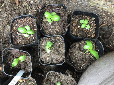 | 3週間ほど前にプランターに種蒔きしたバジルの小さな苗をポットに移植した。 |
