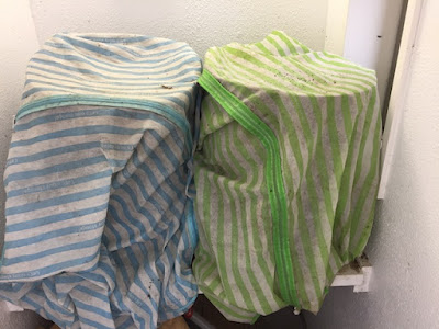 プランターを3段に重ねたどんぶり小屋には、他の虫が入らないように座布団収納袋で覆っている。