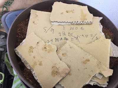 | 通常は、表面をダンボールで覆い、その時の堆肥収穫状況の記載をしている。 覆いがなかったのは、前回の堆肥収穫時に、時間の余裕がなかったのだろう。 |