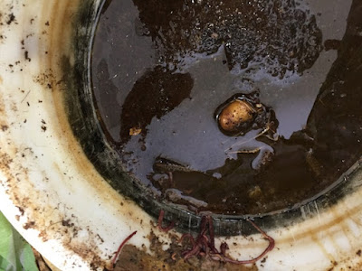 さらに、下段の下に置いている液肥溜めの容器にも、液肥だけでなくシマミミズが30匹ほど居た。