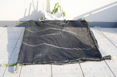 | コンクリートの間に30cmほどの隙間を作ったことにより、コンクリートの熱の影響を押さえれる? 蔓はこの遮光シートの上に這わせる予定だ。 |