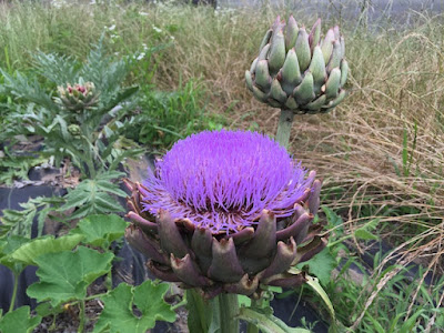 もしかしたら、この弱った苗でももう1輪咲くかもしれない。 右側に見える蕾が膨らんできた。 奥に見える、別のアーティチョークの苗にも、咲きそうな蕾が見える。 |