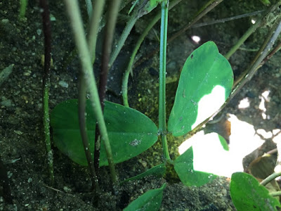 | かんかん照りが続いた日、子房柄は硬い土の中に潜れなかったみたいだ。 土の上に小さな落花生を作り始めていた。 |