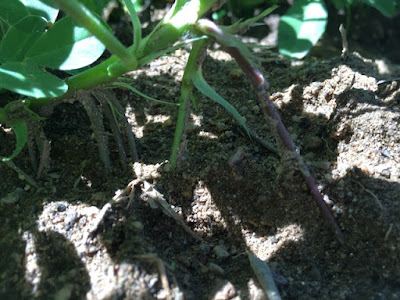 | 苗が横に広がっている場所の下には、子房柄がたくさん出ていた。 そんな場所には、特にしっかり土寄せをしておいた。 |
