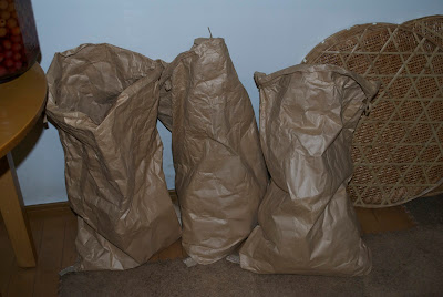 | この3つの袋に、アンデス赤、デストロイヤー、男爵芋を別々に保存している |