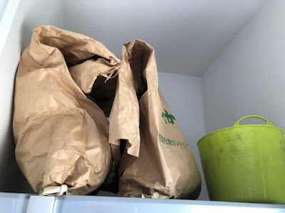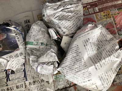 | こんな感じで新聞紙でくるみ、米袋に入れて冷蔵庫の上に保存中だ。 |