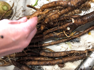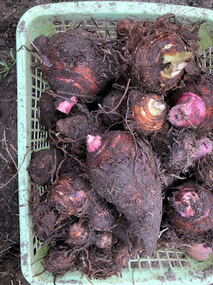 | やはり茎葉が青いうちは土に埋めておくと芋が太るのだ。 小さな子芋の幾つかも、収穫できる大きさになっていた。 |