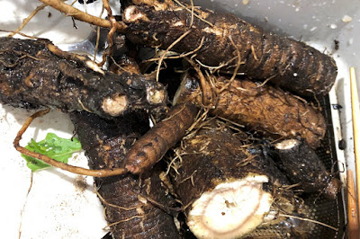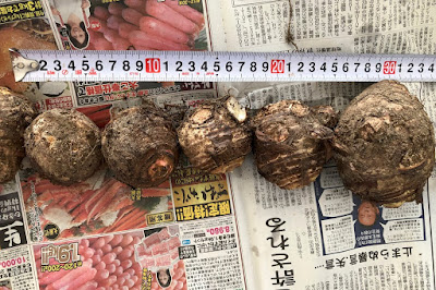 そして今日は、11月頃収穫した里芋の親芋を、まだ青かった茎葉と共に土の中に深めに埋めていたので、これらを取り出してみた。