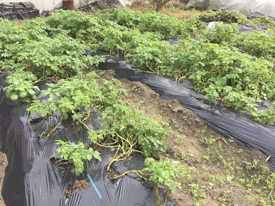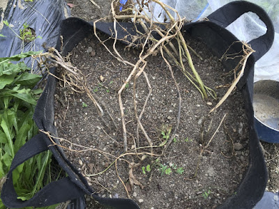 通常こんな遊び心で、実験的に植える芋はうまく育たないのが常なのだが、上の写真の袋に植えたシワシワ芋で苗が途中まですくすくと育っていたので、こんな時期に種芋を植えたらどうなるかも見てみることにしたのだ。