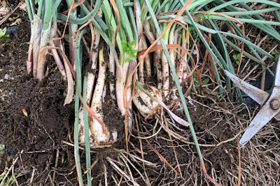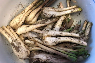 | まだ細いラッキョウを味噌漬けにするために収穫した。 |