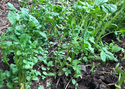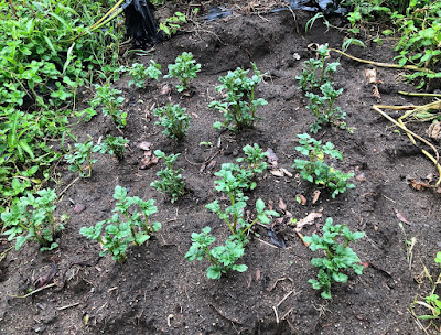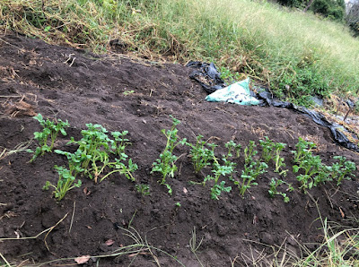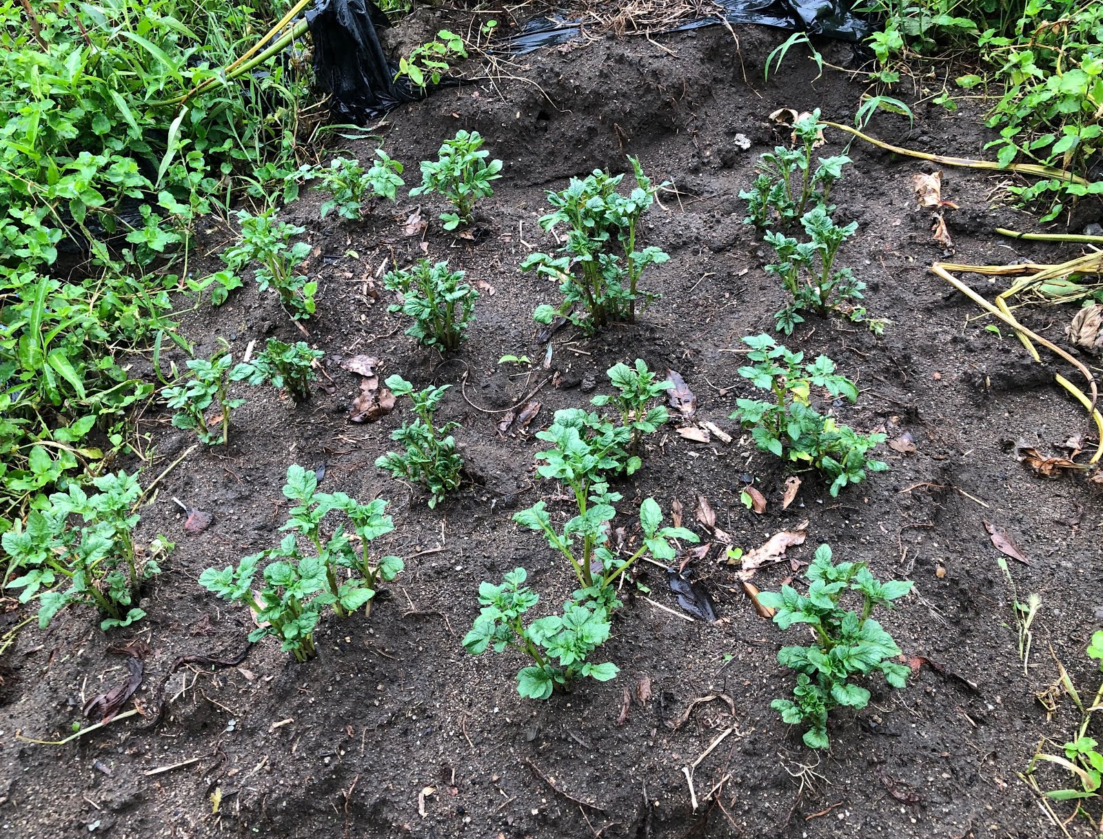 | 今日ヒョロ苗が付いた種芋を全て植え終えたかったが、出来たのは手前の一畝だけ。 出ている苗は5日前に里芋の収穫跡地に移植したものよりかなりヒョロ苗だ。 |