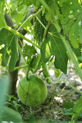 | 自然発生のゴーヤはイチジクの木にまとわりついて冬瓜と共にぶら下がっていた。 |