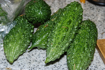 | 自然発生のゴーヤはイチジクの木にまとわりついて冬瓜と共にぶら下がっていた。 |