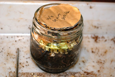 | こんな小さなガラス容器に300個程入れた卵、10/5と記載しているのは11/5の誤り。これから内容を広げて赤ちゃんミミズや卵の回収だ。横には回収に用いる細めのドライバー。最初の卵投入300個は多すぎ! |